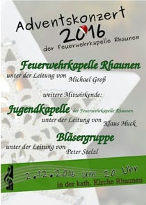 Am Freitag, den 02.12.16 findet um 20 Uhr in der kath. Kirche St. Martin in Rhaunen ein Adventskonzert der Feuerwehrkapelle Rhaunen statt. Unter Mitwirkung der Jugendkapelle Rhaunen, sowie der Bläsergruppe Stelzl möchten wir Sie gerne auf Weihnachten einstimmen und Ihnen die Möglichkeit bieten, der allgemeinen Hektik der Vorweihnachtszeit zu entfliehen.