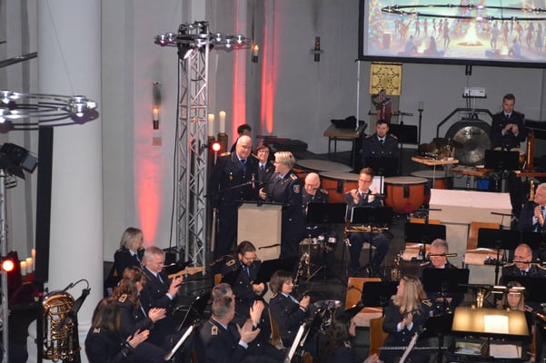 Die anschließende „Musikalische Weihnachtsreise“ der Feuerwehrkapelle begann mit einem Ausflug nach Kanada: Das berühmte „Hallelujah“ von Leonhard Cohen sorgte unter der bewährten Leitung Michael Groß schon gleich zu Beginn für ein fast spirituelles Erlebnis, wie Luisa Kuhn in ihrer Moderation zu recht bemerkte. Als bestens vorbereitete „Reiseleiterin“ führte sie die begeisterten Zuhörer zu den insgesamt acht Reisezielen und lieferte dabei wertvolle Informationen zu den Weihnachtsbräuchen in den einzelnen Ländern. Visuell unterstützt wurden ihre Ausführungen durch beeindruckende KI-generierte Bilder, die auf eine große Leinwand projiziert wurden. Johannes Jaenicke hatte diese Aufgabe ChatGPT übertragen und bemerkte zu Recht, dass bei der Rechtschreibung dieser Software noch Luft nach oben ist. Die sich anschließende „Rhapsody für Flügelhorn/Trompete und Blasorchester“ komponierte der aus Belgien stammende André Waignein im Jahr 1990. Mit ihren modernen Harmonien führte sie in eine ganz andere musikalische Welt. Den anspruchsvollen Solopart übernahm dabei Armin Renkel. Nach „Carol oft he Bells“ aus der Ukraine folgte ein Ausflug nach Italien in die Welt der Oper: Mit dem berühmten „Nessun dorma“ aus der Oper Turandot von Giacomo Puccini sorgte Bernhard Hellbrück als Solist für den nächsten Gänsehaut-Moment. Bei einer etwas reduzierteren Bläser-Besetzung wäre seine Gesangskunst sicher noch besser zur Geltung gekommen. Ein Ausflug nach Russland durfte nicht fehlen: Was könnte in dieser Jahreszeit besser geeignet sein als die schwungvolle „Peterburger Schlittenfahrt“, komponiert allerdings vom in Merseburg geborenen Richard Eilenberg. In die USA führte „A Christmas Festival“, ein Medley mit bekannten Weihnachtsmelodien aus dem englischen Sprachraum. Bei „Drei Nüsse für Aschenputtel“ von Karel Svoboda aus Tschechien wird sicher der eine oder andere überlegt haben, wie oft er schon diesen Märchenfilm gesehen und die dazu gehörende zauberhafte Filmmusik gehört hat. Zum Abschluss wurden die Konzertbesucher mit „Feliz Navidad“ noch musikalisch nach Spanien entführt.